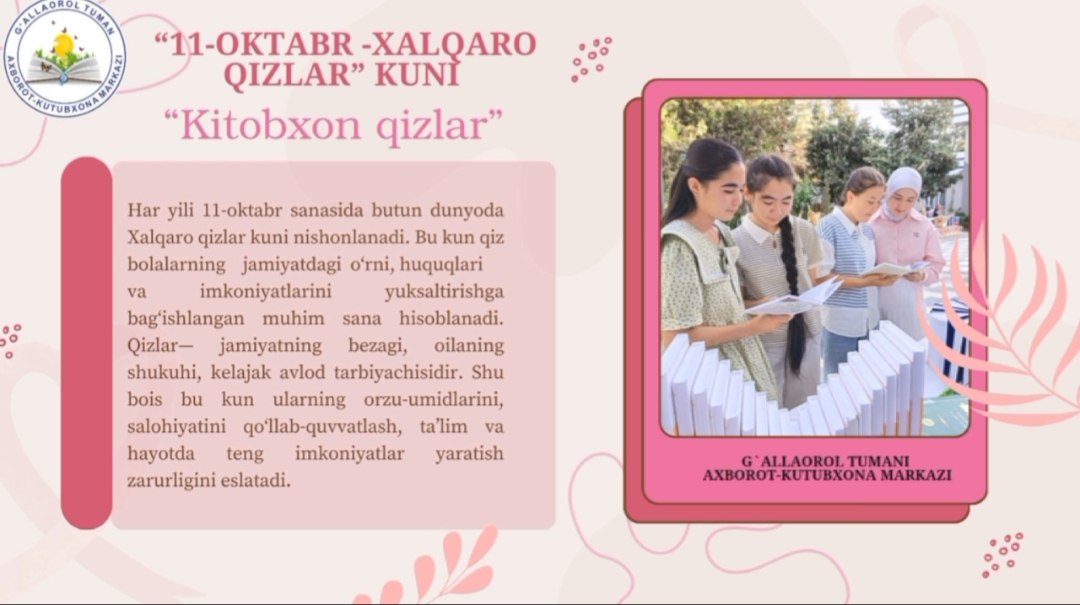 Xalqaro qizlar kuni munosabati bilan Joriy yilning 6-11-oktabr kunlari G'allaorol tumani axborot-kutubxona markazida “Dunyoni tinchlik va ezgulikka ilhomlantiramiz!” shiori ostida ma’naviy-marifiy tadbirlar bo’lib o’tmoqda.