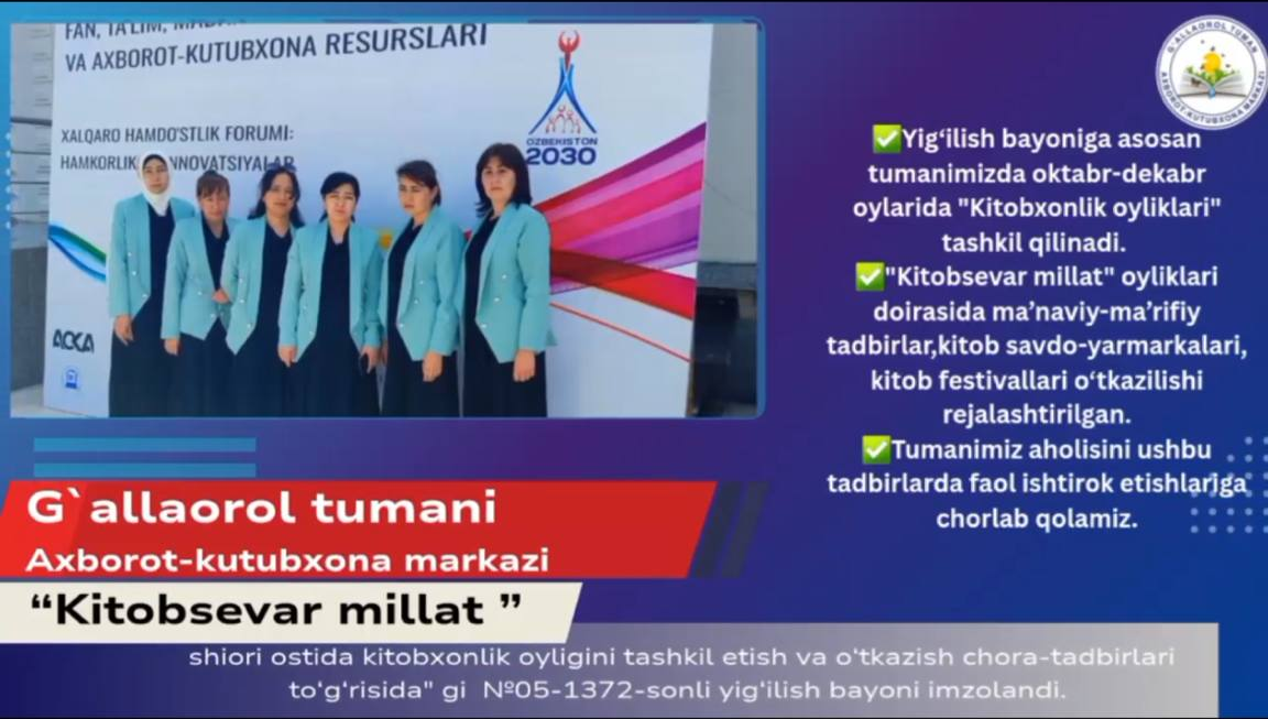 ✅Yig‘ilish bayoniga asosan tumanimizda oktabr-dekabr oylarida "Kitobxonlik oyliklari" tashkil qilinadi.