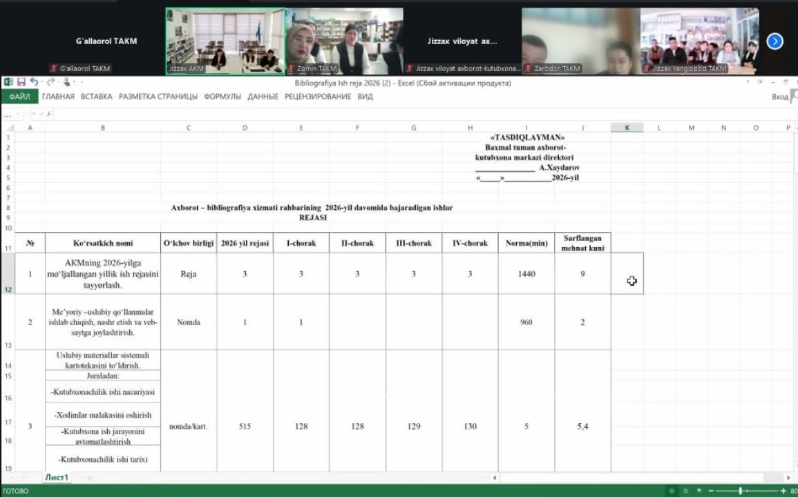 Jizzax viloyati Sharof Rashidov nomidagi axborot- kutubxona markazi Ilmiy-metodik xizmati tomonidan tashkil etilgan Namunaviy ish rejalar to‘g‘risida zoom yig‘ilishi bo‘lib o‘tdi.Yig'ilishda G‘allaorol TAKM xodimlari ishtirok etdilar 4 ta bo‘limning ish rejalari haqida tushuncha berib o‘tildi.